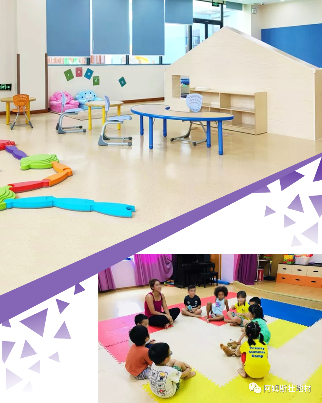 阿姆斯壮地材产品从安全环保角度出发,不仅脚感舒适,柔软具有弹性,而且色彩丰富、防滑耐磨、健康环保,可以应用到幼儿园的各种场所。